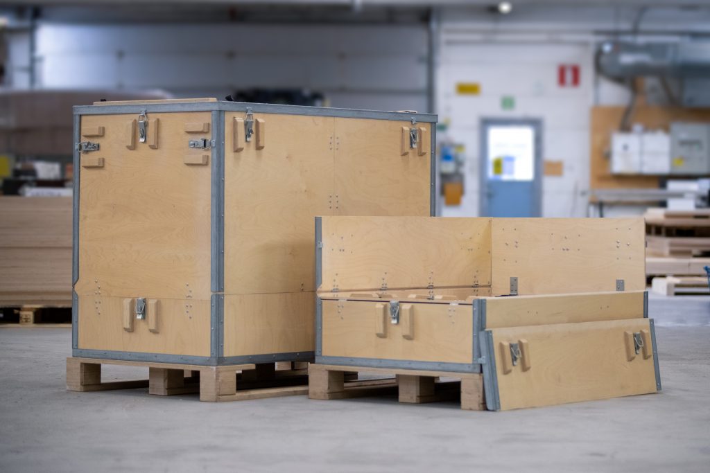 The purpose of a combination package can be, for example, transfer of already painted products from a subcontractor to a production line. Depending on the inner parts, a package be may partly folded when empty, and then you save in return freight costs.